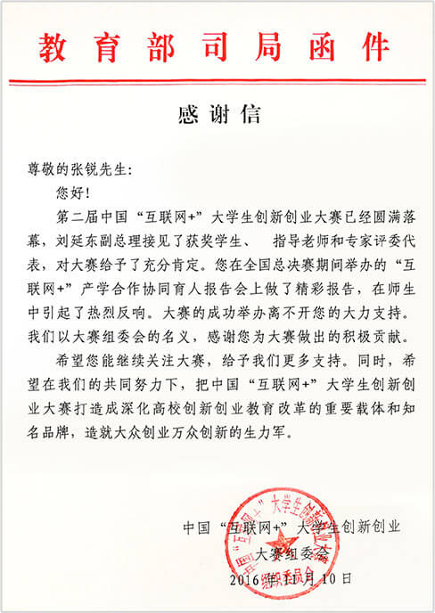 2018年,壹号娱乐连续多年为中国国际互联网+大学生创新创业大赛做出积极贡献,获教育部来函致谢。